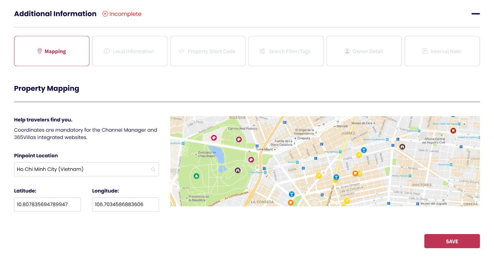 El mapeo muestra la ubicación exacta de la propiedad. Se integra con el Motor de Reservas de GuestWisely y con los canales, ayudando a los viajeros a encontrar la propiedad fácilmente. Busca tu dirección en el campo “Pinpoint Location” y fíjala en el mapa.