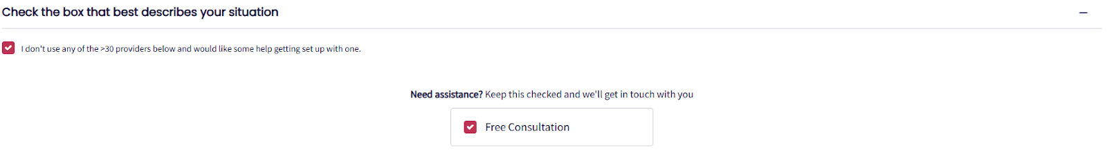 1. Selecciona la opción: “No uso ninguno de los >30 proveedores listados y me gustaría recibir ayuda para configurar uno.”