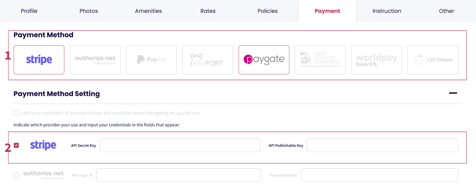 1. Ve a Gestor de Portfolio > Configuración de Propiedades > Métodos de Pago y selecciona la pasarela de pago que deseas usar para esa propiedad.