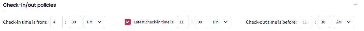 Las reglas configuradas en esta sección (Políticas de Check-In/Check-Out) se aplican a todas las reservas de la propiedad seleccionada (o adicionales, si se guardan conjuntamente).