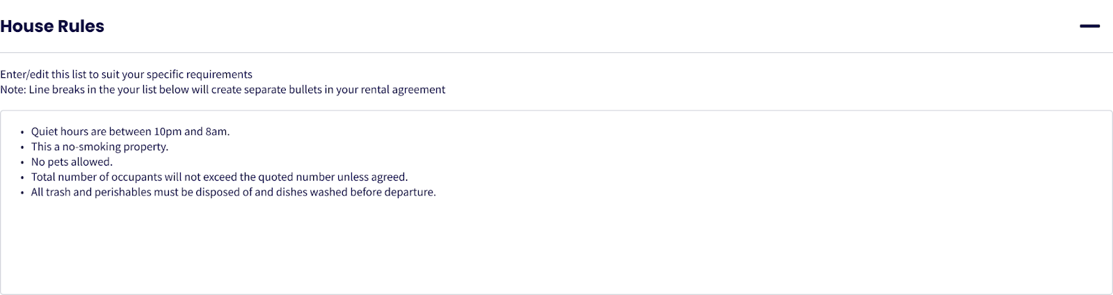 Establece pautas claras para los huéspedes durante su estancia. Especifica las condiciones de uso de las amenidades.