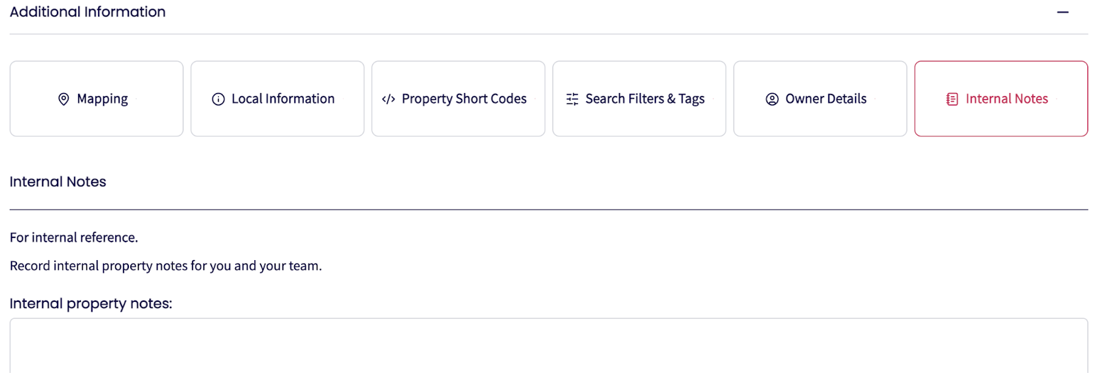 En esta sección puedes añadir toda la información esencial de tu propiedad: nombre, tipo, dirección, descripciones y contenido multimedia. También incluye herramientas de mapeo, asignación de propietarios y filtros/tags de búsqueda para mejorar la visibilidad y la organización.