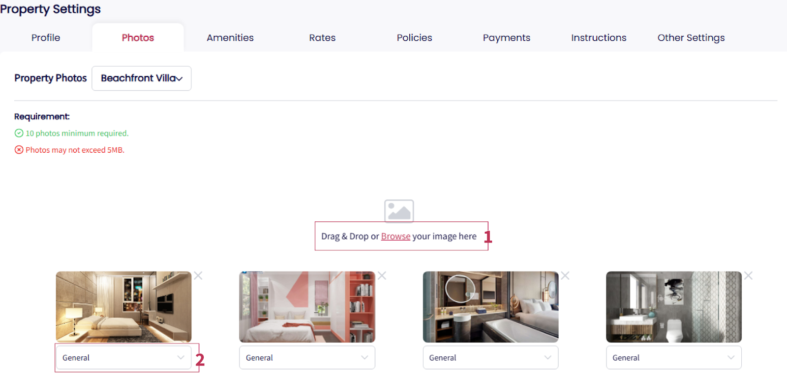 2. Elige una categoría de foto en el menú desplegable (p. ej. Habitación, Propiedad, Amenidades).