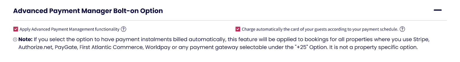 Nota: Aunque puedes usar diferentes pasarelas o cuentas por propiedad, evita ofrecer soluciones duplicadas de pago con tarjeta (por ejemplo, Stripe y Authorize.net en la misma propiedad).