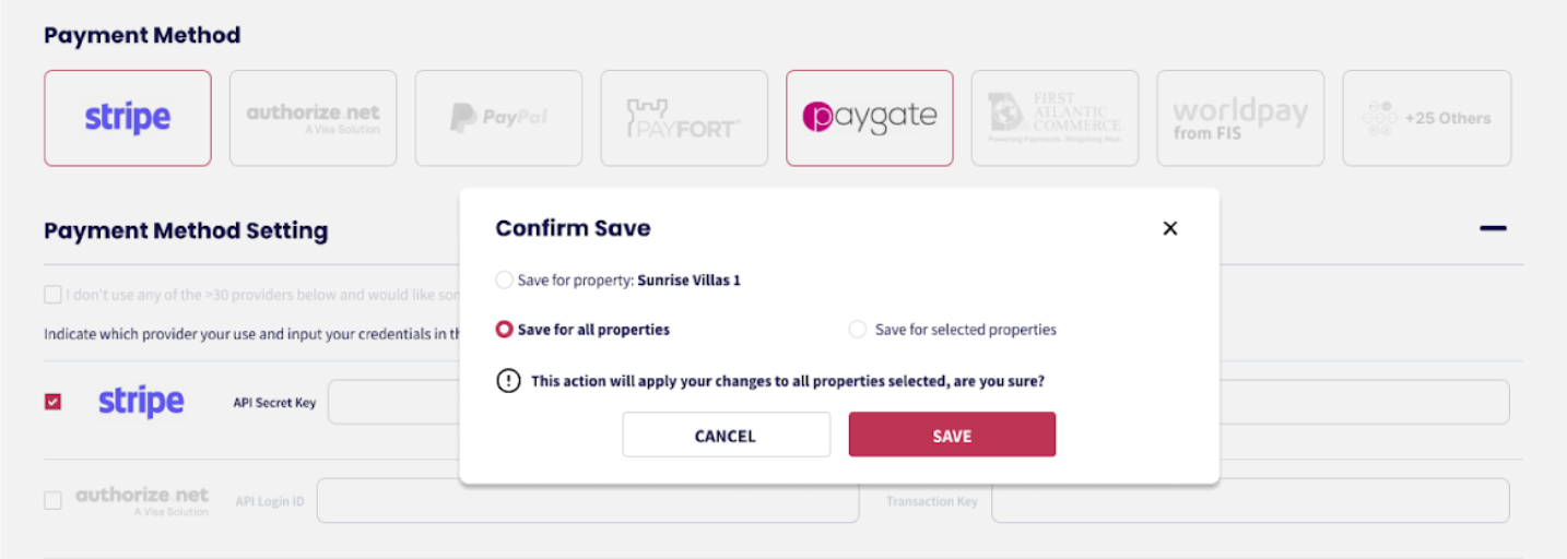 Guardar tu configuración de pago: Para agilizar las operaciones y evitar tener que volver a configurarla, puedes guardar la configuración de pago para todas las propiedades o seleccionar algunas en particular.