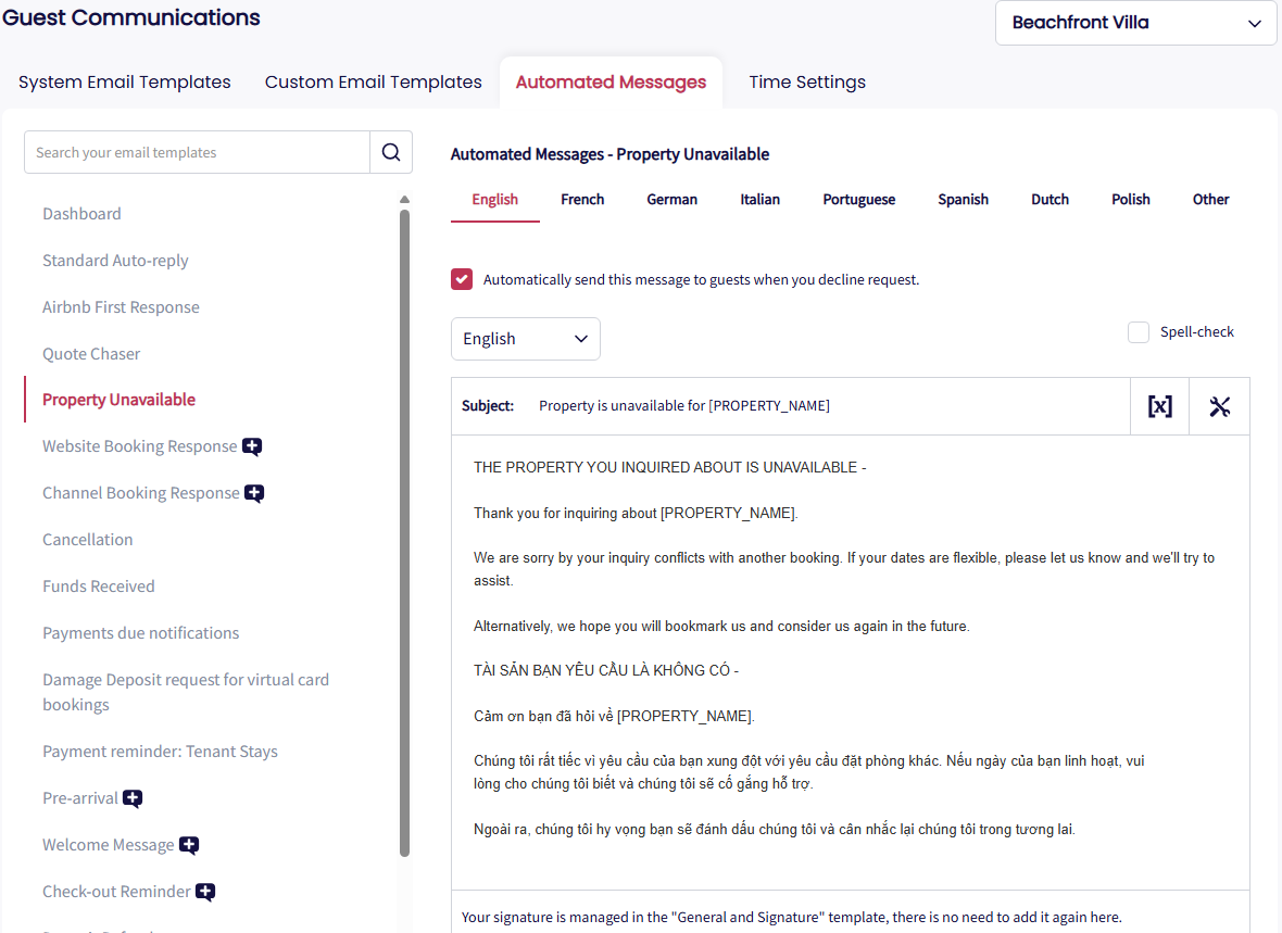 GuestWisely también le permite utilizar códigos dinámicos que insertan automáticamente detalles específicos, como el nombre del huésped, la información de la reserva o las instrucciones de la propiedad, dentro de sus mensajes. Esto ahorra tiempo y asegura consistencia en todas sus comunicaciones. Además, los filtros de spam personalizables ayudan a mantener su bandeja de entrada organizada al bloquear correos no deseados y permitir sólo la comunicación relevante.