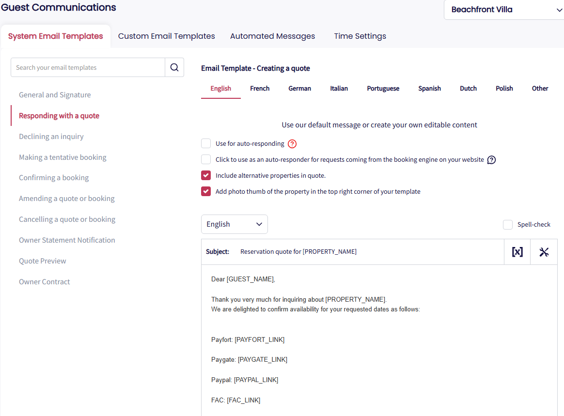 En todas estas comunicaciones, GuestWisely ofrece códigos dinámicos que insertan automáticamente detalles como el nombre del huésped, la información de la reserva o las instrucciones de la propiedad. A diferencia de los marcadores estáticos, los códigos de sustitución pueden extraer datos en tiempo real e incluso realizar cálculos, como determinar el saldo pendiente de un huésped en el momento en que se envía un correo electrónico. Con una colocación sencilla en sus plantillas de correo, estos códigos garantizan precisión, ahorro de tiempo y consistencia en todas las comunicaciones.