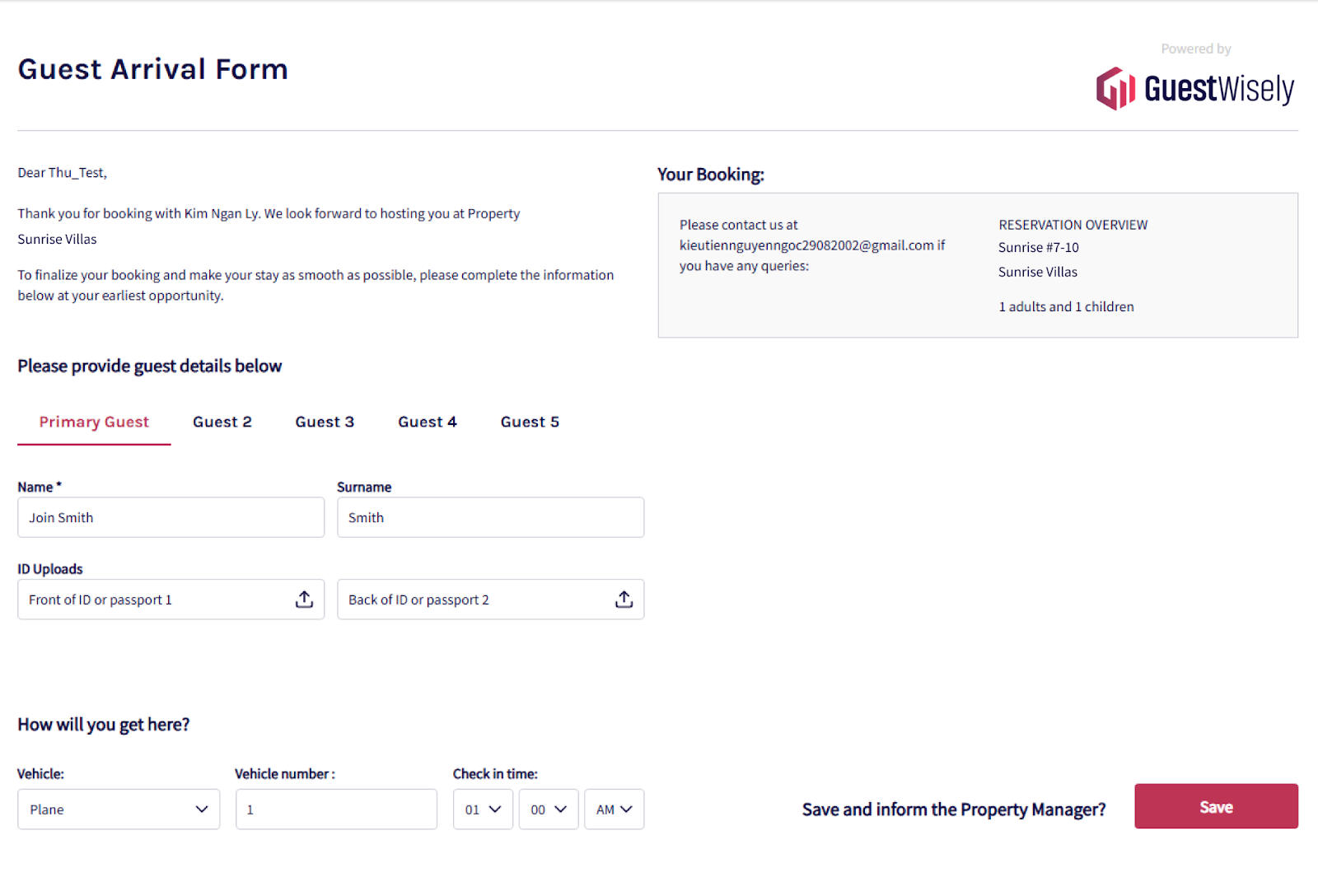 La comunicación con los huéspedes desempeña un papel crucial en la experiencia de hospitalidad, especialmente durante el proceso de llegada. El Formulario de Llegada de GuestWisely ayuda a agilizar los check-ins al recopilar toda la información necesaria con anticipación, reduciendo la necesidad de seguimientos repetitivos y coordinación manual. Esto no sólo aligera la carga de trabajo del administrador de la propiedad, sino que también cumple un papel importante en el cumplimiento de requisitos normativos, como la recolección de información de pasaporte o del documento de identidad, cuando sea aplicable.