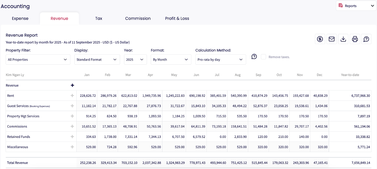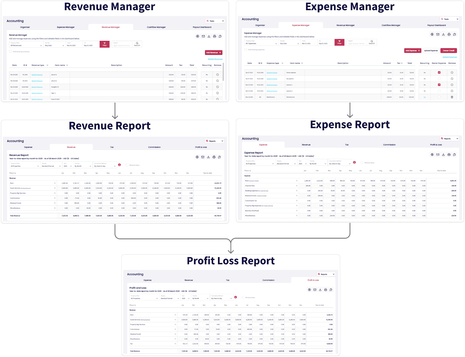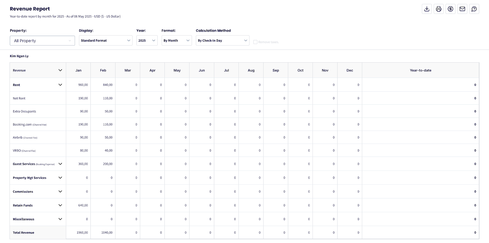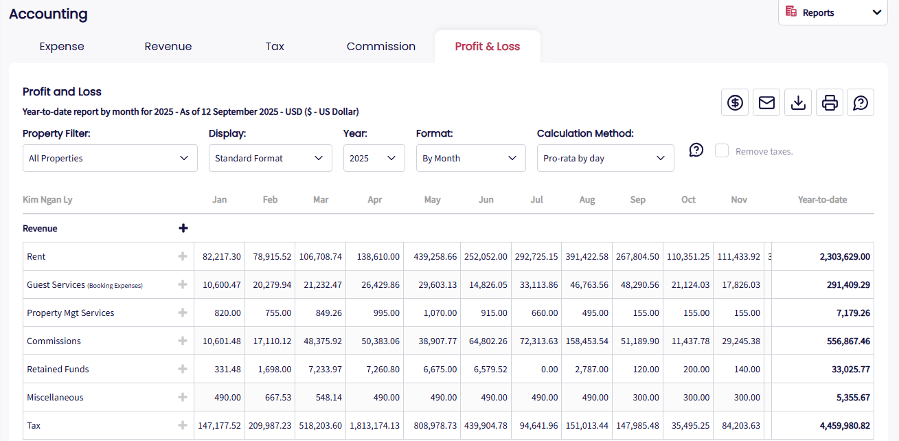 El Informe de Ingresos ofrece una visión completa de tus entradas: reservas, servicios a huéspedes, transacciones con propietarios y otras fuentes de ingresos. Aplica automáticamente los impuestos y deducciones (como Cargos de Canal y comisiones), ayudándote a gestionar ingresos de forma efectiva.