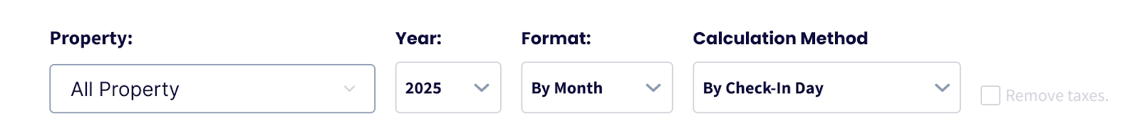 Puedes ocultar impuestos usando la casilla “Remove taxes” en cada informe. Esto los elimina tanto de la vista como de los cálculos.