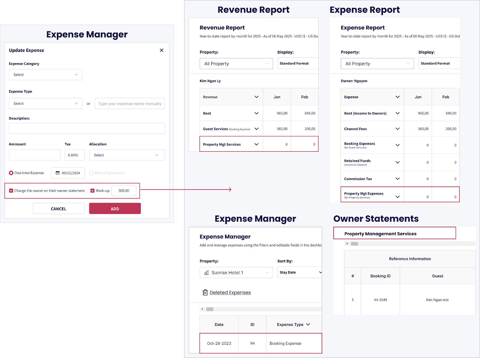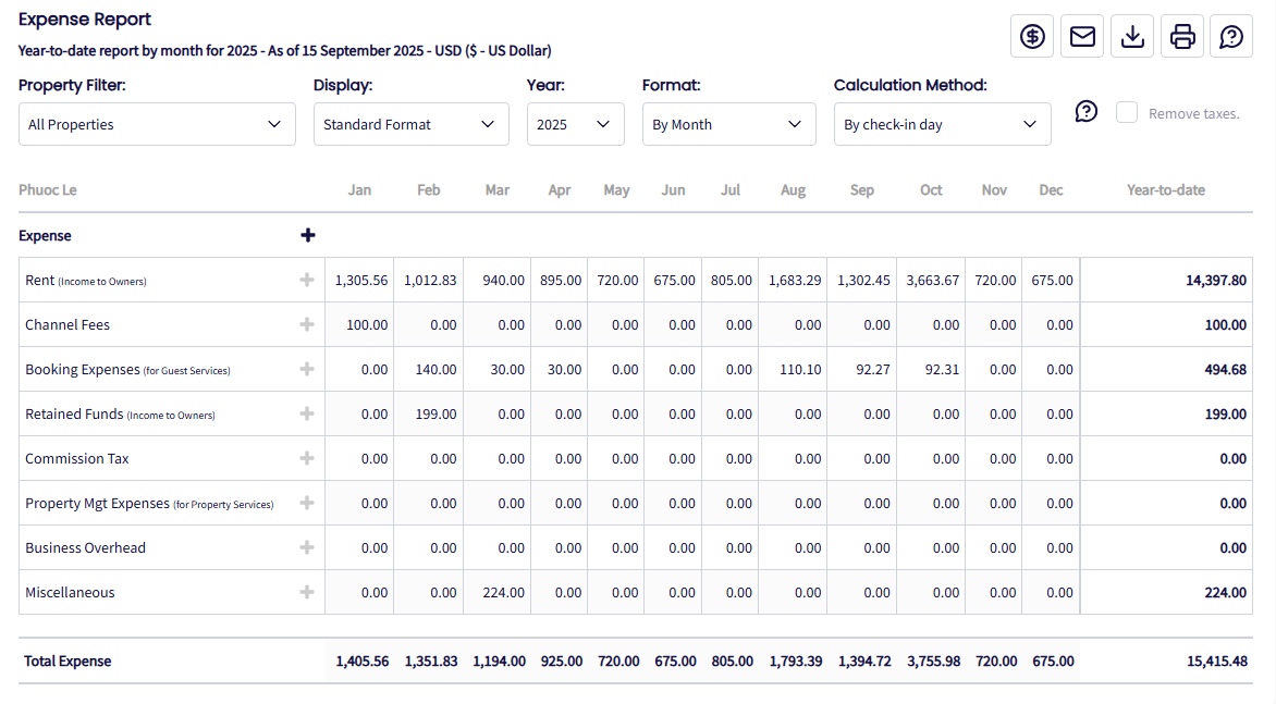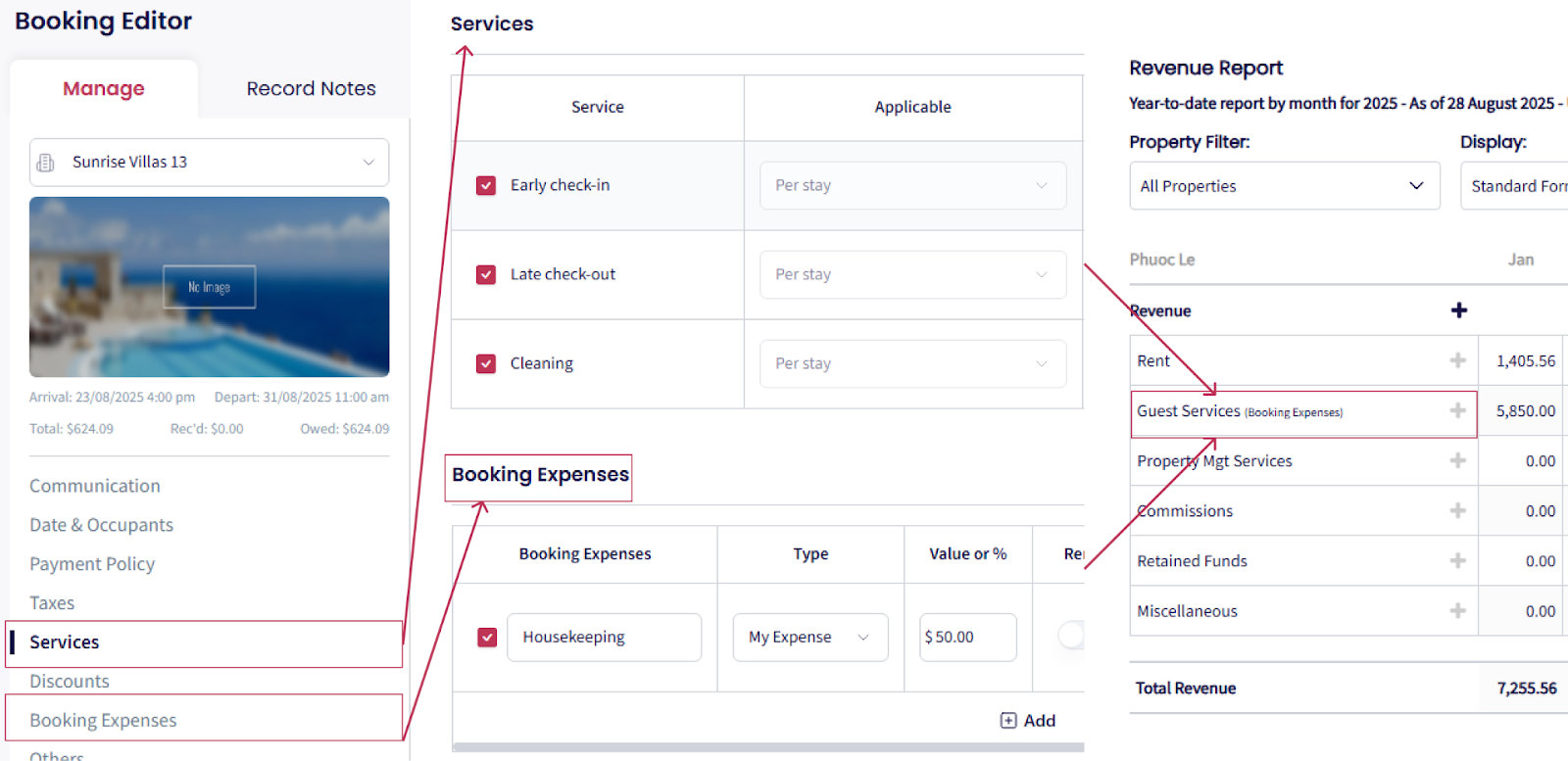 Si alguno de estos gastos está marcado como Gasto de Propietario, también aparecerá en la sección Servicios de Huéspedes del Informe de Ingresos.