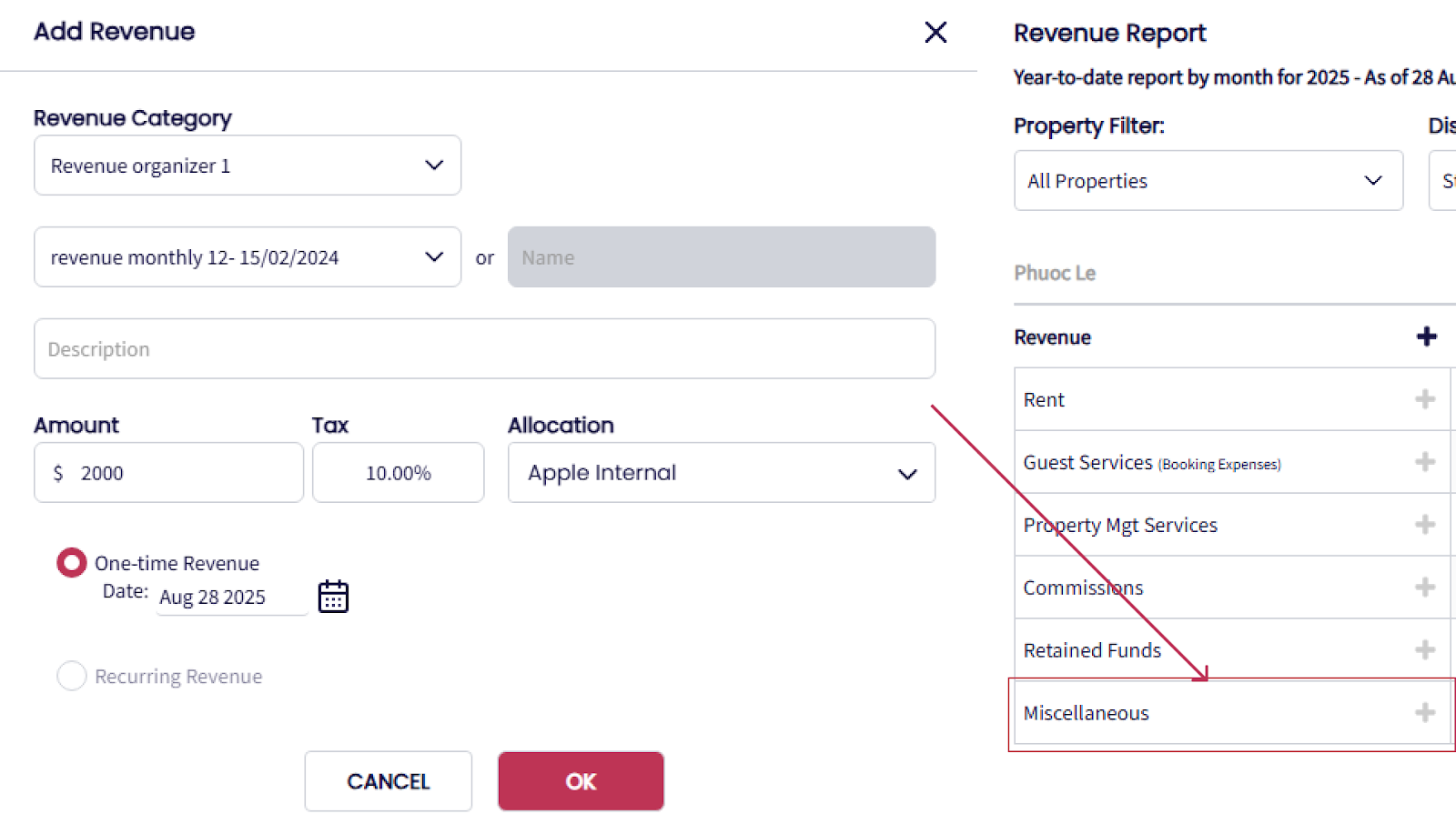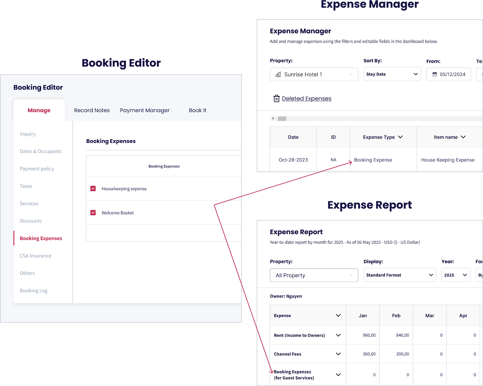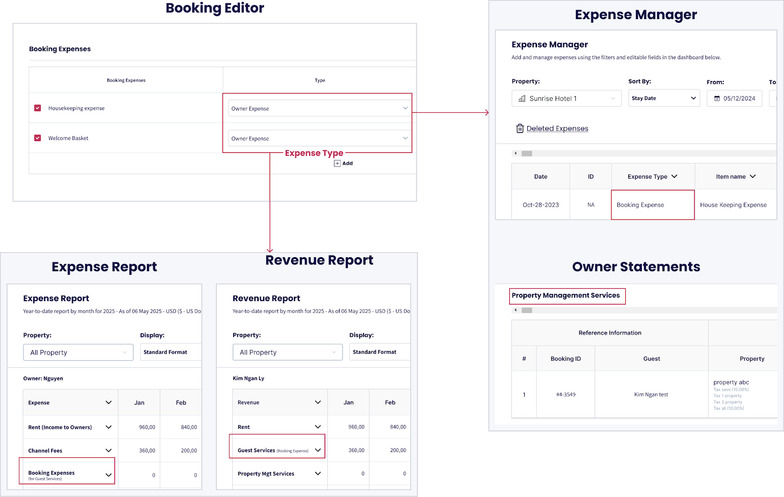 Si alguno de estos gastos está marcado como Gasto de Propietario, también aparecerá en la sección Servicios de Huéspedes del Informe de Ingresos.