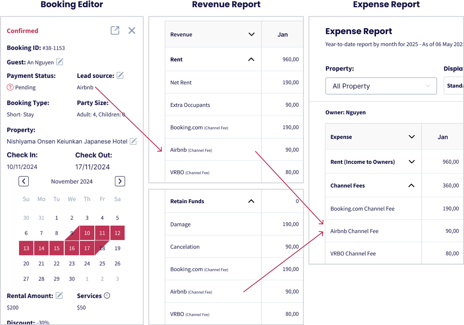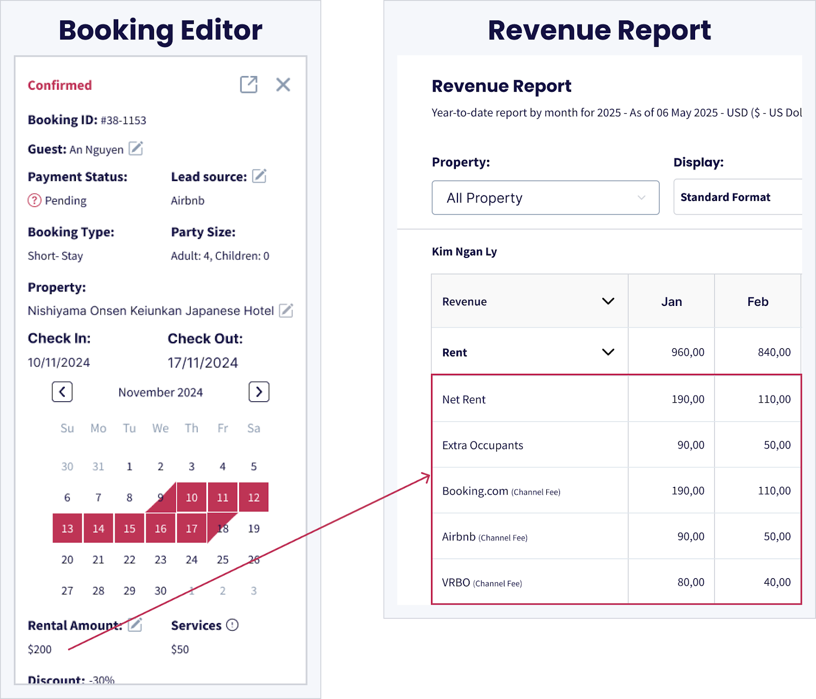 Refleja los ingresos netos de alquiler, junto con cualquier cargo adicional por ocupantes, transferidos al propietario después de deducir la comisión del canal.