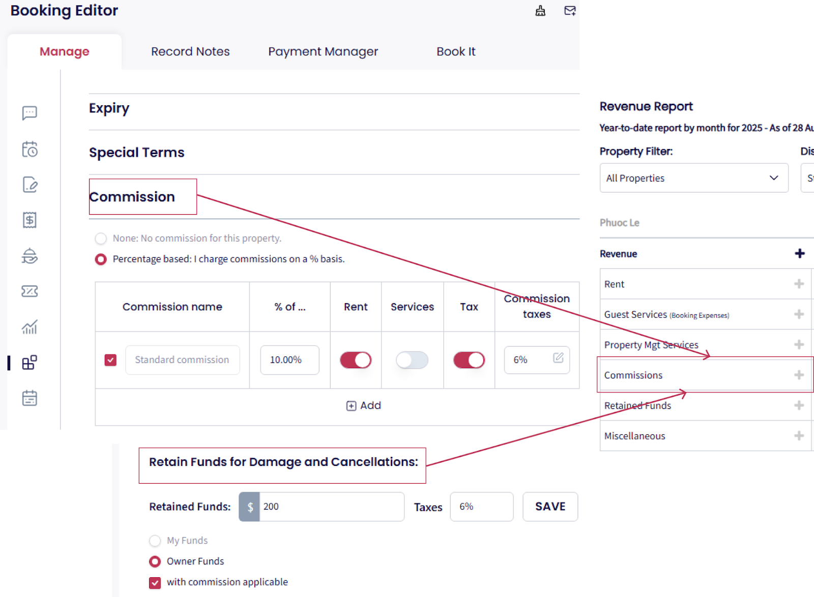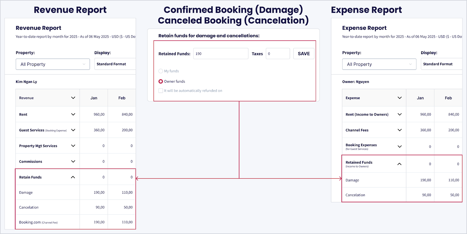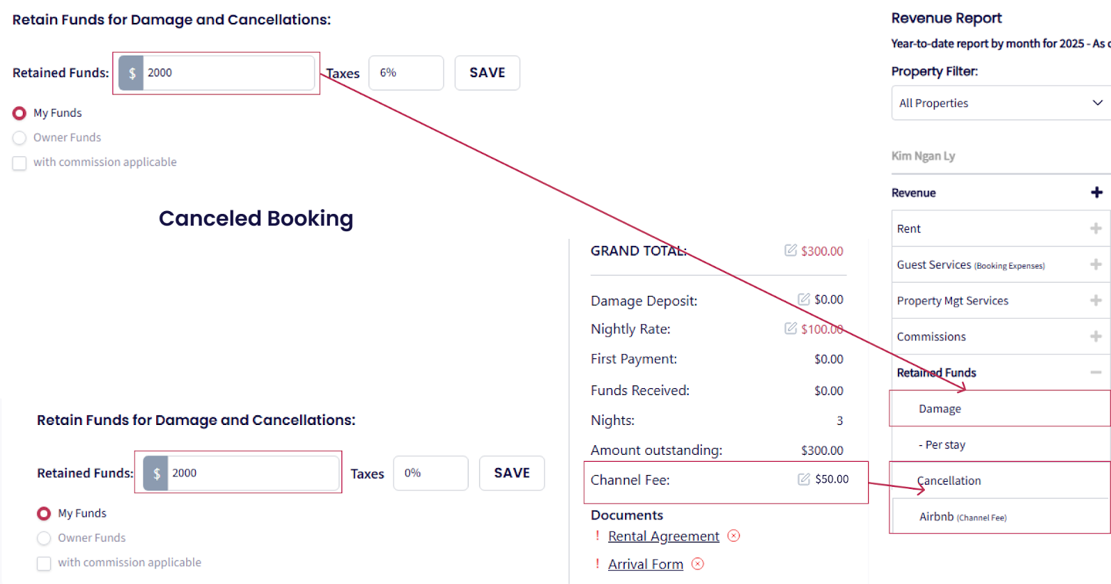 Si recibes un monto como Fondos Retenidos (por ejemplo, por cancelación o reclamación de daños) y lo marcas como Fondos de Propietario, este monto será transferido al propietario y aparecerá bajo este ítem.