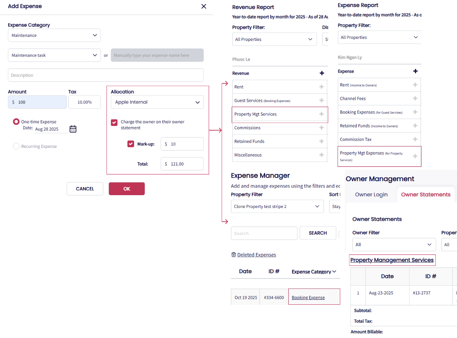 Si alguno está marcado como Gasto de Propietario, también se reflejará en la sección Servicios de Gestión de Propiedades del Informe de Ingresos.