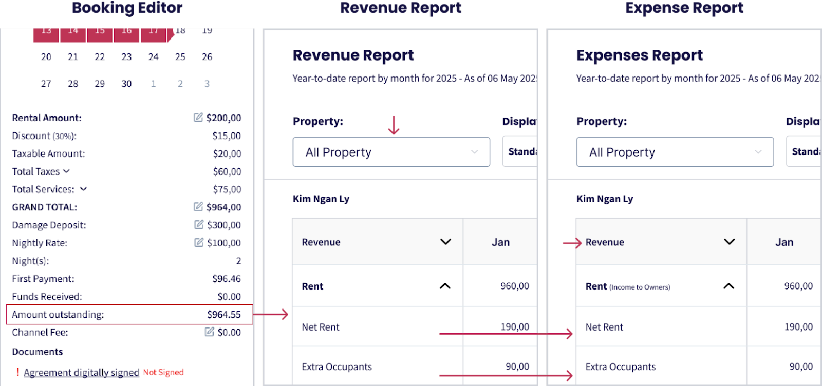 Para propiedades gestionadas, los importes de Renta Neta y Ocupantes Adicionales deben ser iguales tanto en el Informe de Ingresos como en el Informe de Gastos.