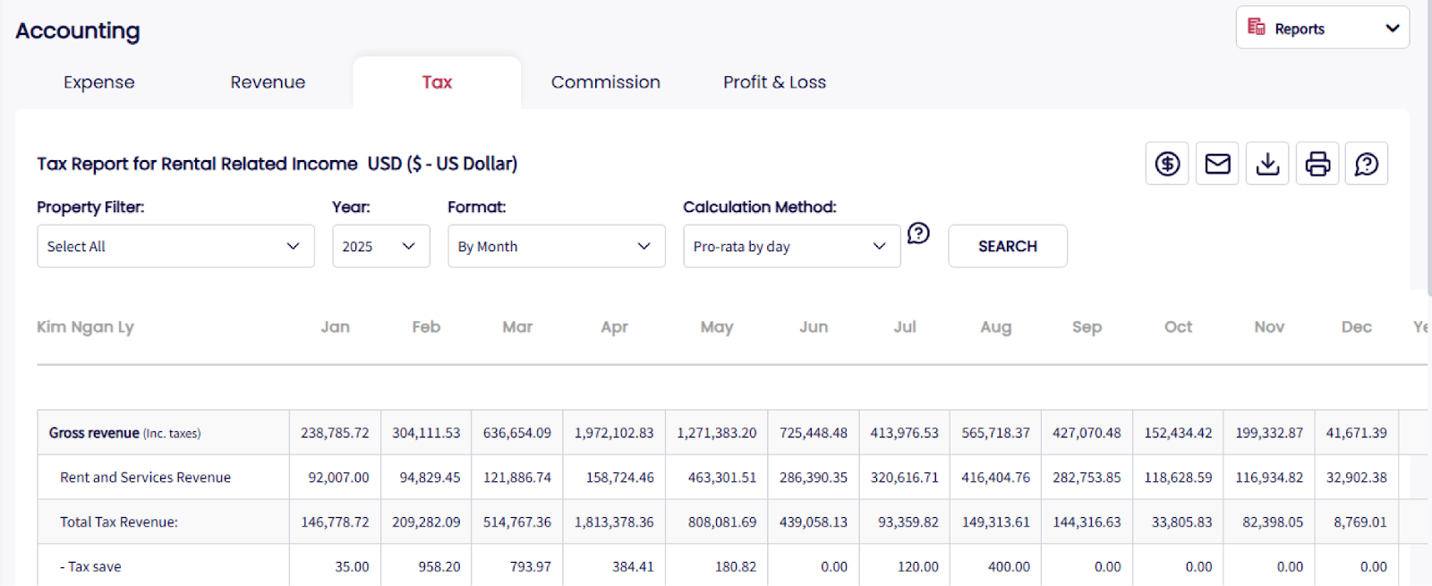 El Informe de Impuestos muestra los impuestos recaudados por tipo, como parte de tu operación de alquiler, dando claridad sobre lo que debes pagar a la autoridad tributaria. Puedes ver totales por mes, trimestre o año.