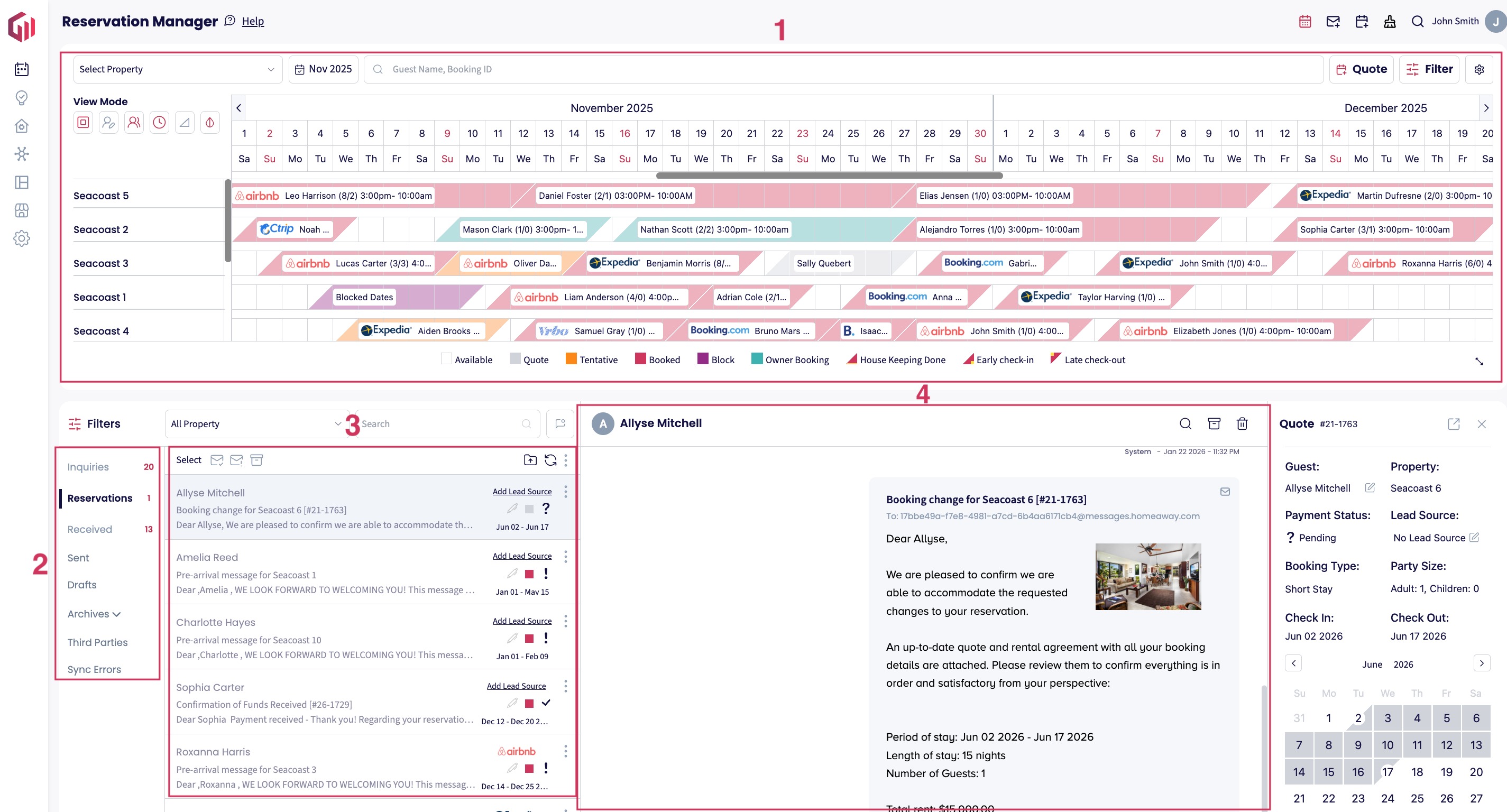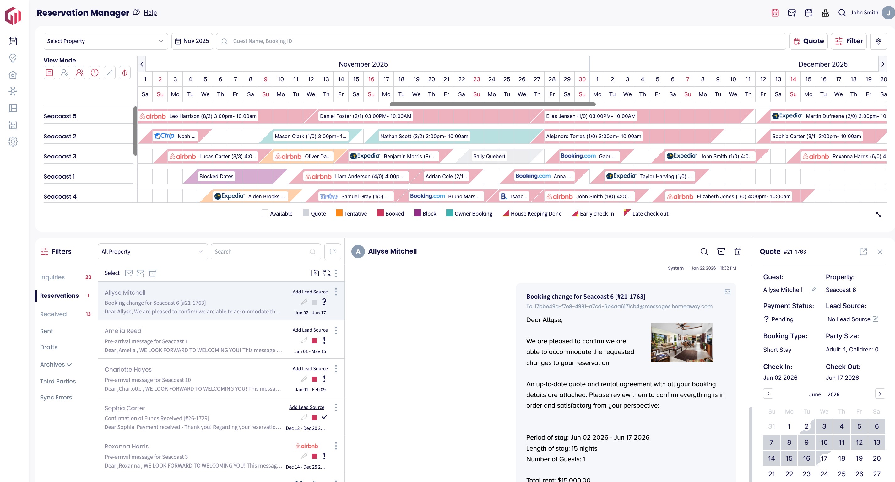 Impulsado por una robusta infraestructura de Comunicaciones Unificadas, el Gestor de Reservas centraliza las comunicaciones con huéspedes de todos los canales de reserva —como Airbnb, Booking.com y Vrbo— y medios de mensajería como correo electrónico, SMS y WhatsApp en una única interfaz simplificada. Además, esta capa de comunicación integra directamente mensajeros de cada canal, permitiendo que el Gestor de Reservas active y coordine de manera fluida las tareas en toda la plataforma de GuestWisely.