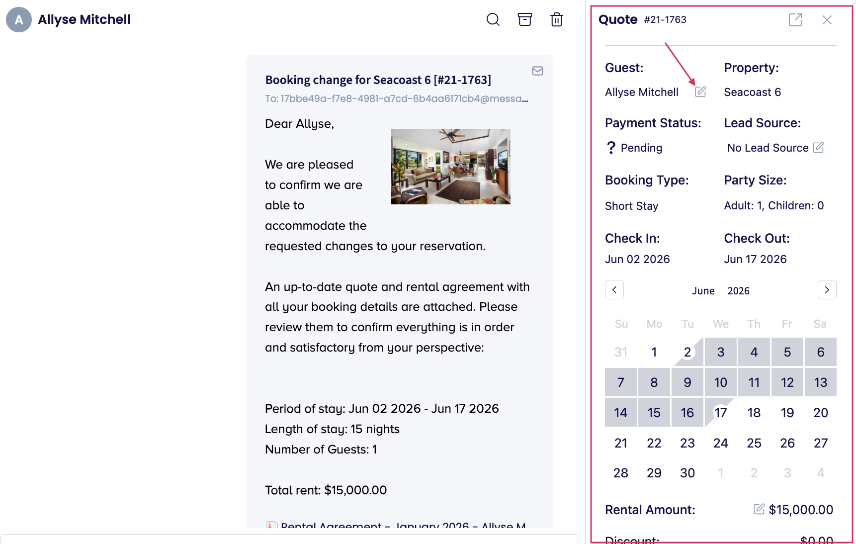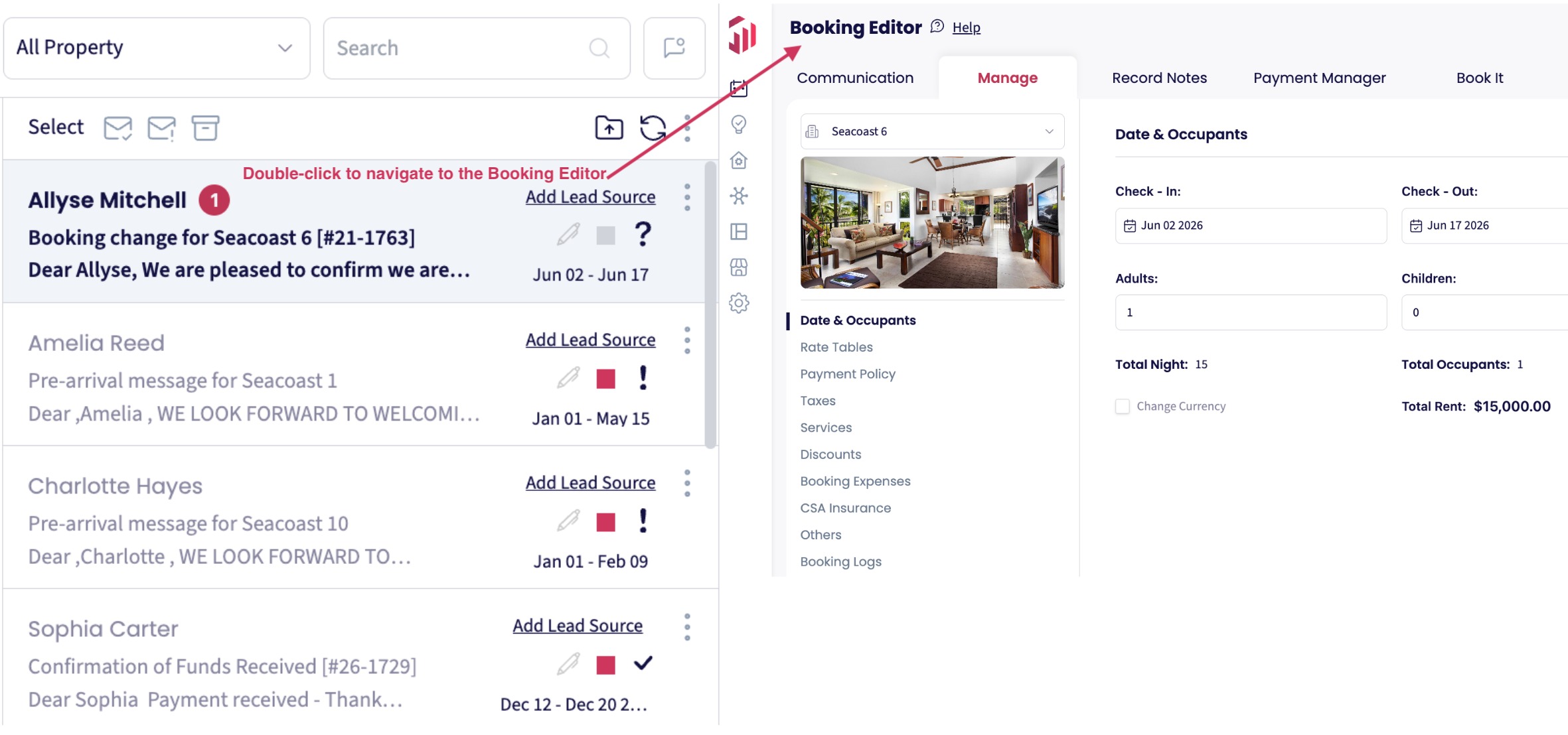 Haz un simple clic en una reserva para ver los mensajes del huésped en la Ventana de Mensajes sin salir de la página principal. Haz clic en Detalles (arriba a la derecha) para ver la información de la reserva
