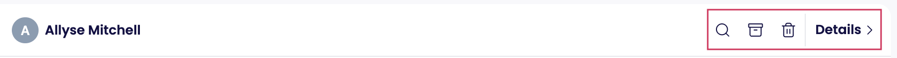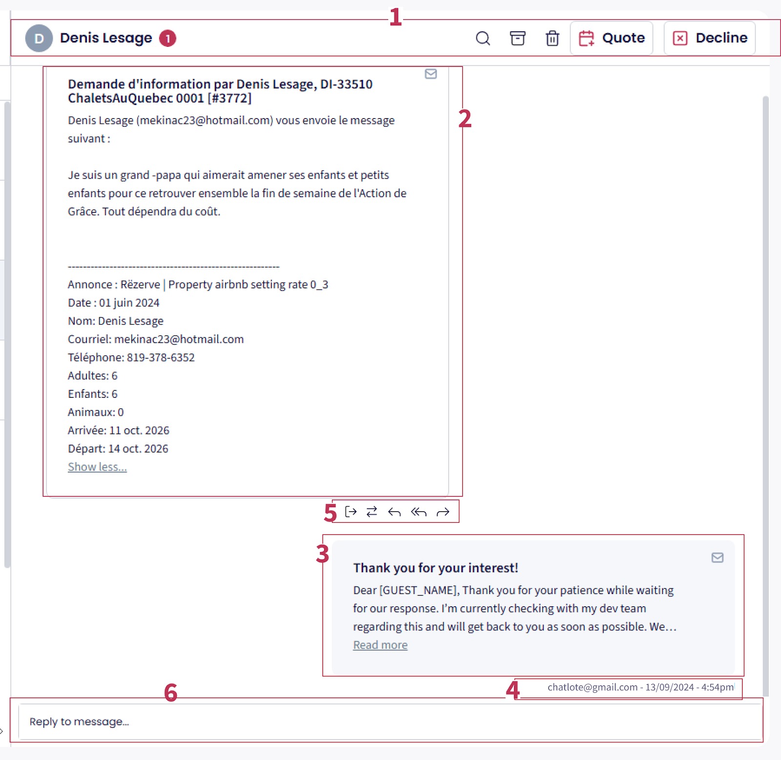 Barra de Herramientas: Haz clic en el nombre del huésped para ver/editar su información de contacto, usa el ícono de búsqueda para encontrar mensajes.Incluye íconos de Archivar y Eliminar. En la carpeta de Consultas, la barra de herramientas también incluye botones de acción como Cotizar o Rechazar.