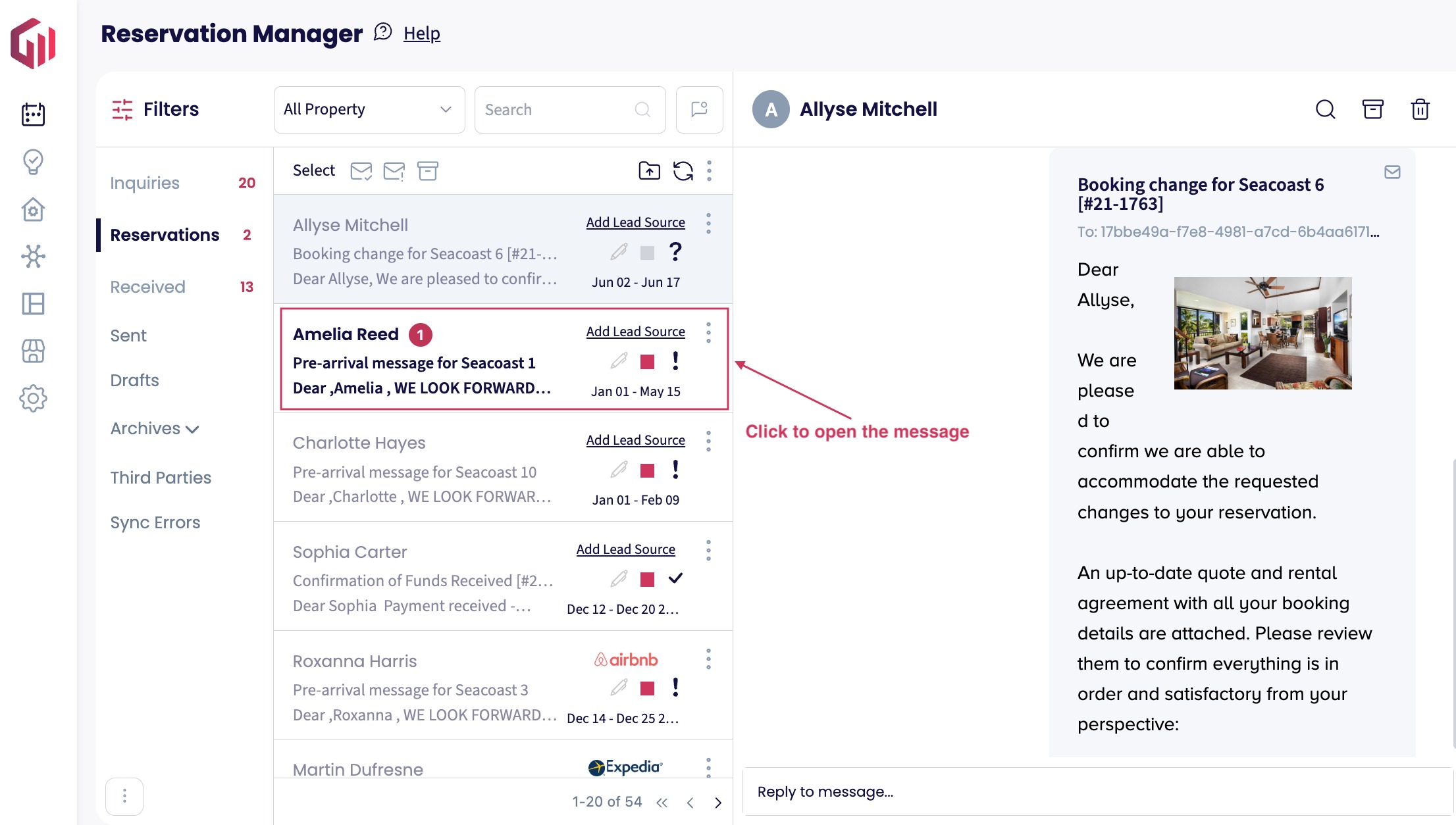 Haz clic en un Mensaje / Archivo de Reserva para abrir tu conversación en la Ventana de Mensajes.
