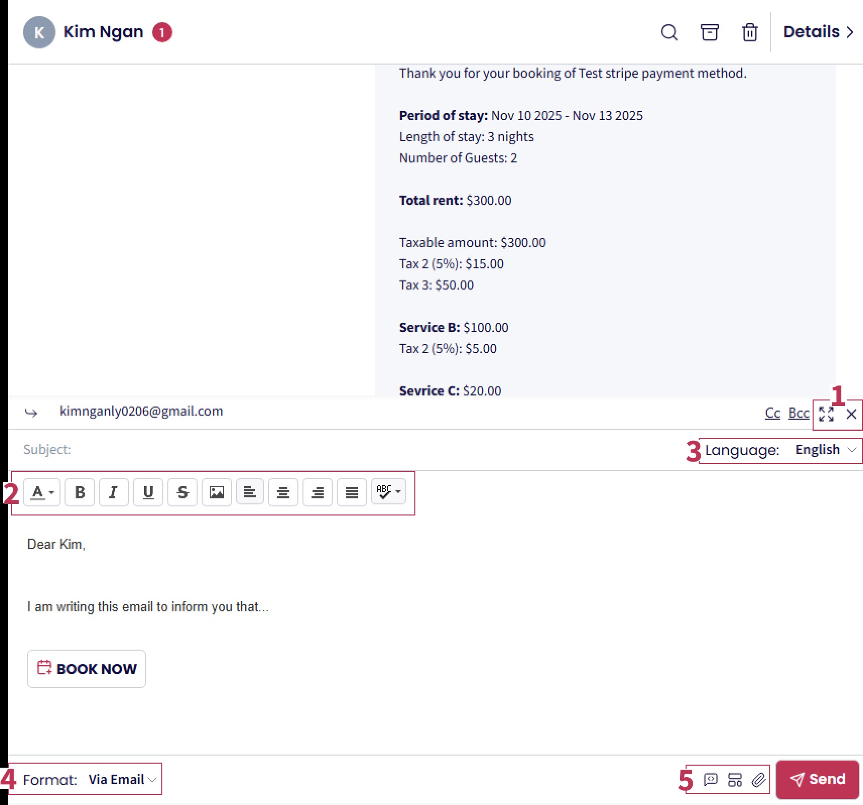 Widget de formato: elige entre correo electrónico, WhatsApp, SMS, Messenger de Airbnb, Vrbo y Booking.com.