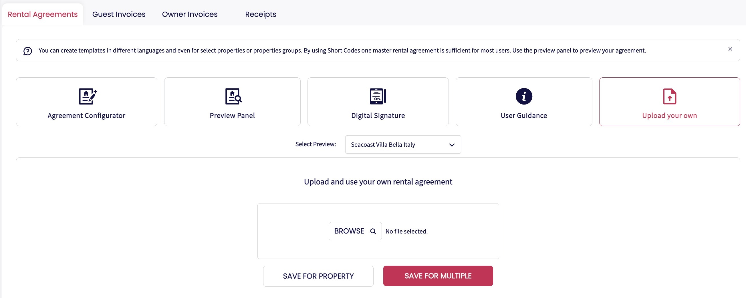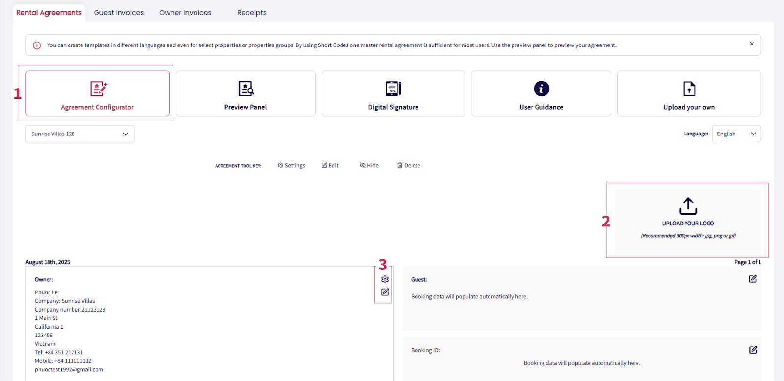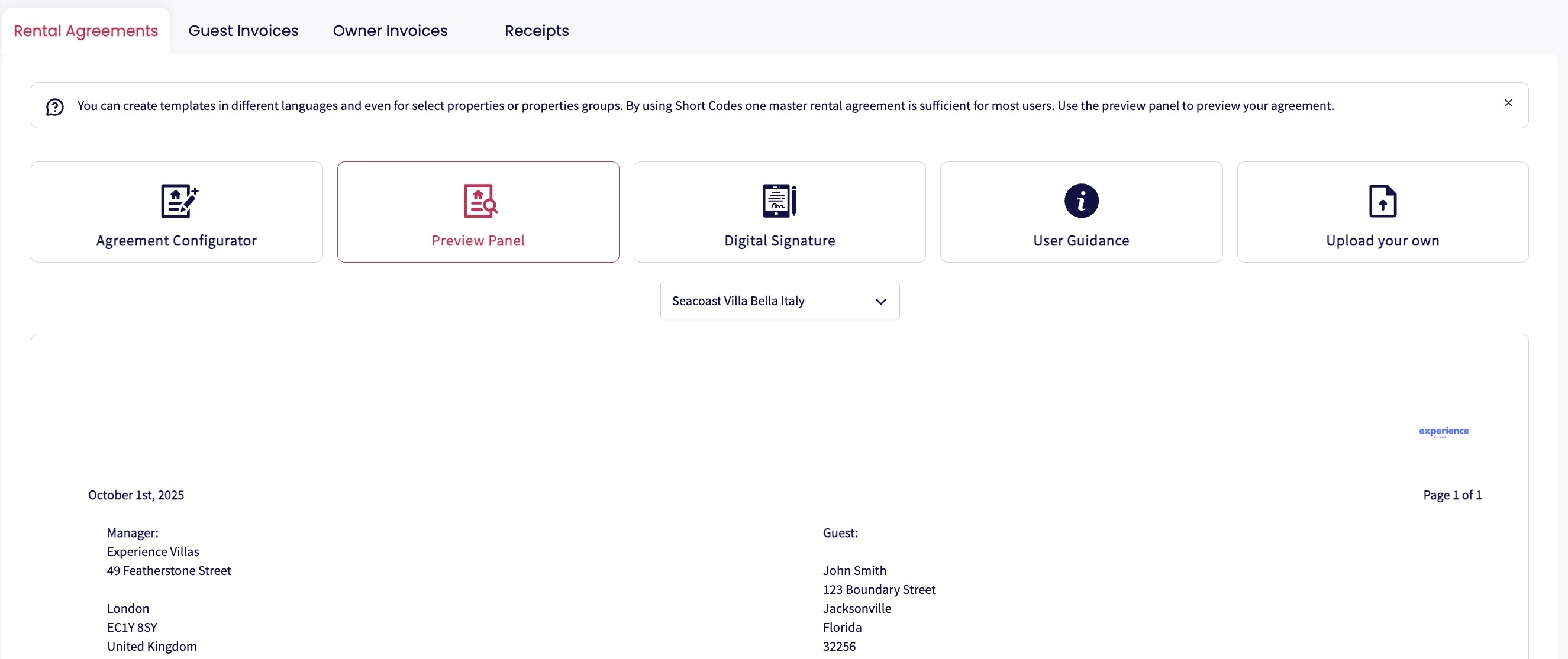 Tu logotipo y esquema de colores se aplican de manera predeterminada en todos los documentos. Una vez listo, puedes previsualizar tu contrato en el Panel de Vista Previa para ver exactamente cómo lo recibirán los huéspedes. Si lo prefieres, también puedes subir tu propio contrato, ya sea para una o varias propiedades.