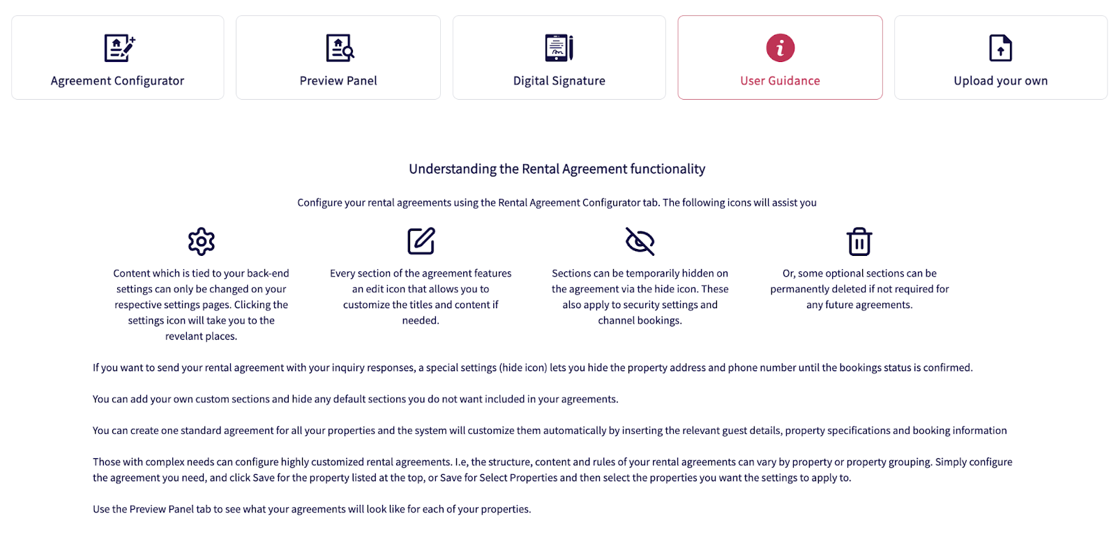Al acceder a la función de Contratos de Alquiler en desde el apartado de Soluciones > Documentos > Contratos de Alquiler, encontrarás este tutorial junto con más información en la pestaña Guía del Usuario. Esta sección ofrece consejos y sugerencias directamente en GuestWisely para ayudarte a configurar y gestionar tus contratos de alquiler de manera fácil y eficaz.