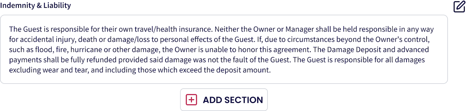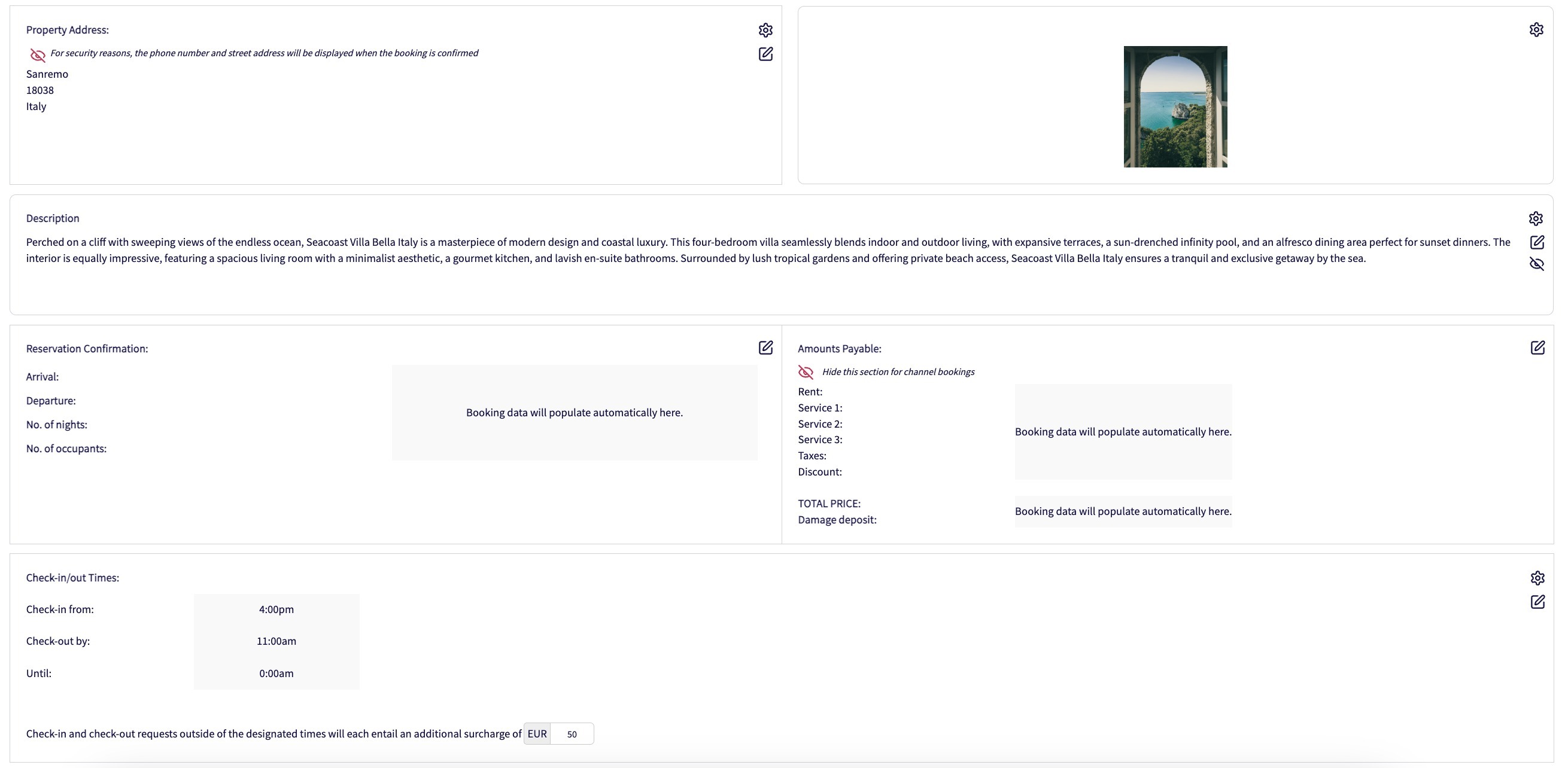 Con el Configurador de Contratos, puedes seleccionar propiedades específicas, personalizar los títulos por secciones, editar el contenido generado por el sistema y añadir secciones personalizadas o de texto libre. Los datos clave, como la información del huésped, la reserva y la propiedad, se completan automáticamente para garantizar precisión y eficiencia. También puedes ocultar secciones irrelevantes, modificar contenido predefinido o añadir nuevas secciones para ajustarlas a tu estilo.
