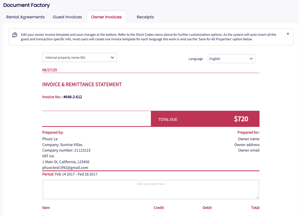 Ten en cuenta también que no se admiten códigos dinámicos en las facturas de propietarios, ya que los datos mostrados provienen de las diferentes propiedades y de las reservas, en lugar de estar vinculados a una sola.