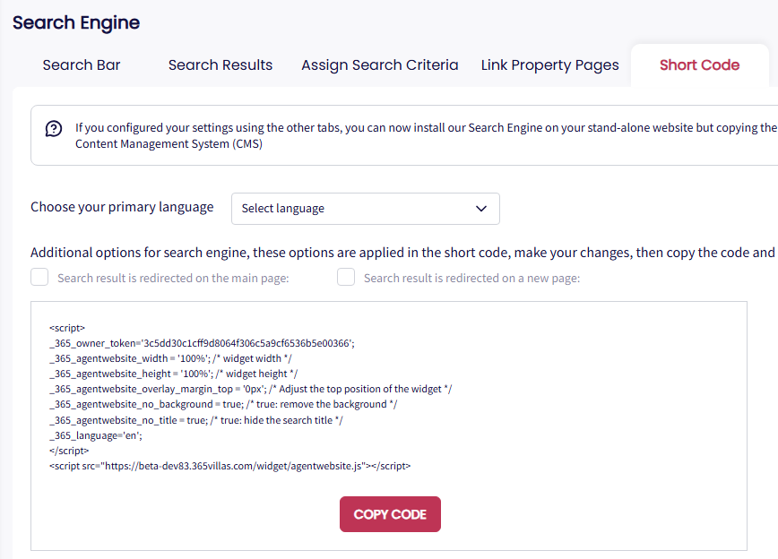 Después de configurar tus ajustes en las demás pestañas, podrás instalar el Motor de Búsqueda en tu Sitio Web Independiente. Este funciona mediante códigos HTML personalizados, configurables por el usuario y específicos para cada cuenta GuestWisely.