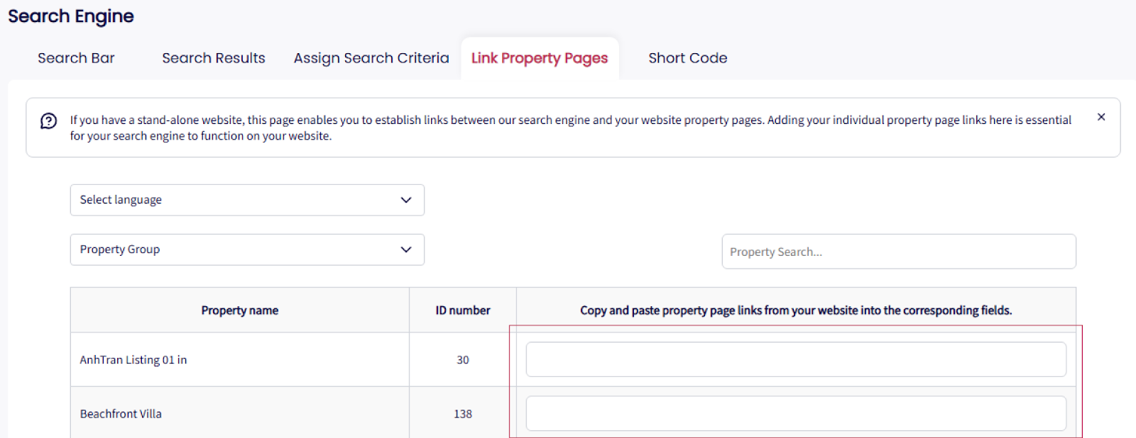 Dado que tu sitio es un Sitio Web Independiente, y no un sitio creado en GuestWisely con integraciones nativas, el sistema no sabe automáticamente cómo redirigir los resultados de búsqueda a las páginas individuales de cada propiedad. Afortunadamente, puedes configurarlo fácilmente en la pestaña Vincular Páginas de Propiedad dentro de GuestWisely: