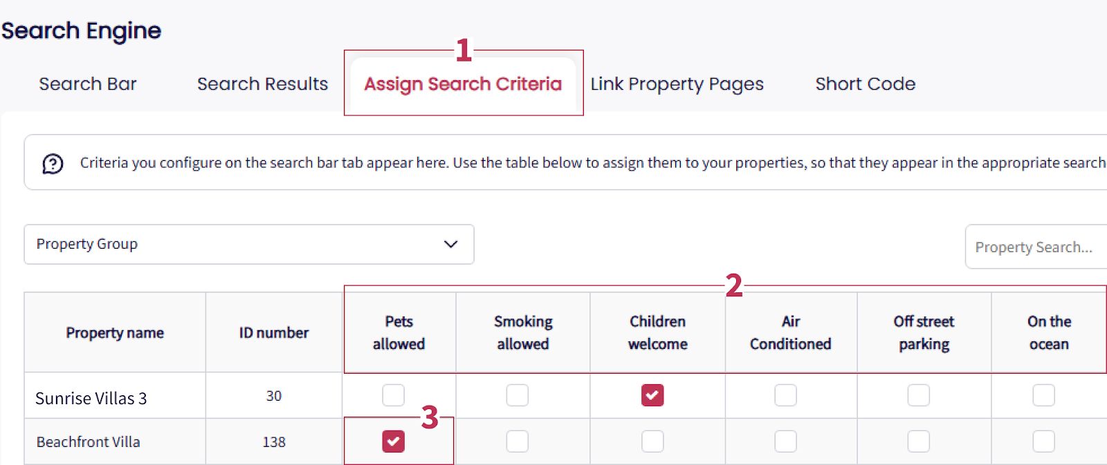 Para cada propiedad, marca las casillas que correspondan a los criterios aplicables. Puedes asignar hasta 8 criterios de búsqueda únicos por propiedad.