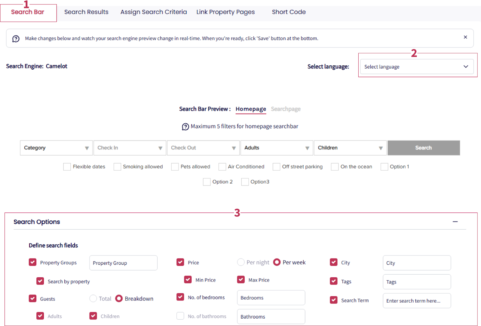 Puedes acceder a esta función desde la barra lateral izquierda de GuestWisely, en Website > Motor de Búsquedas. Es ideal para quienes desean mantener su sitio web actual y, al mismo tiempo, aumentar las conversiones y mejorar la experiencia en la Página de Inicio.