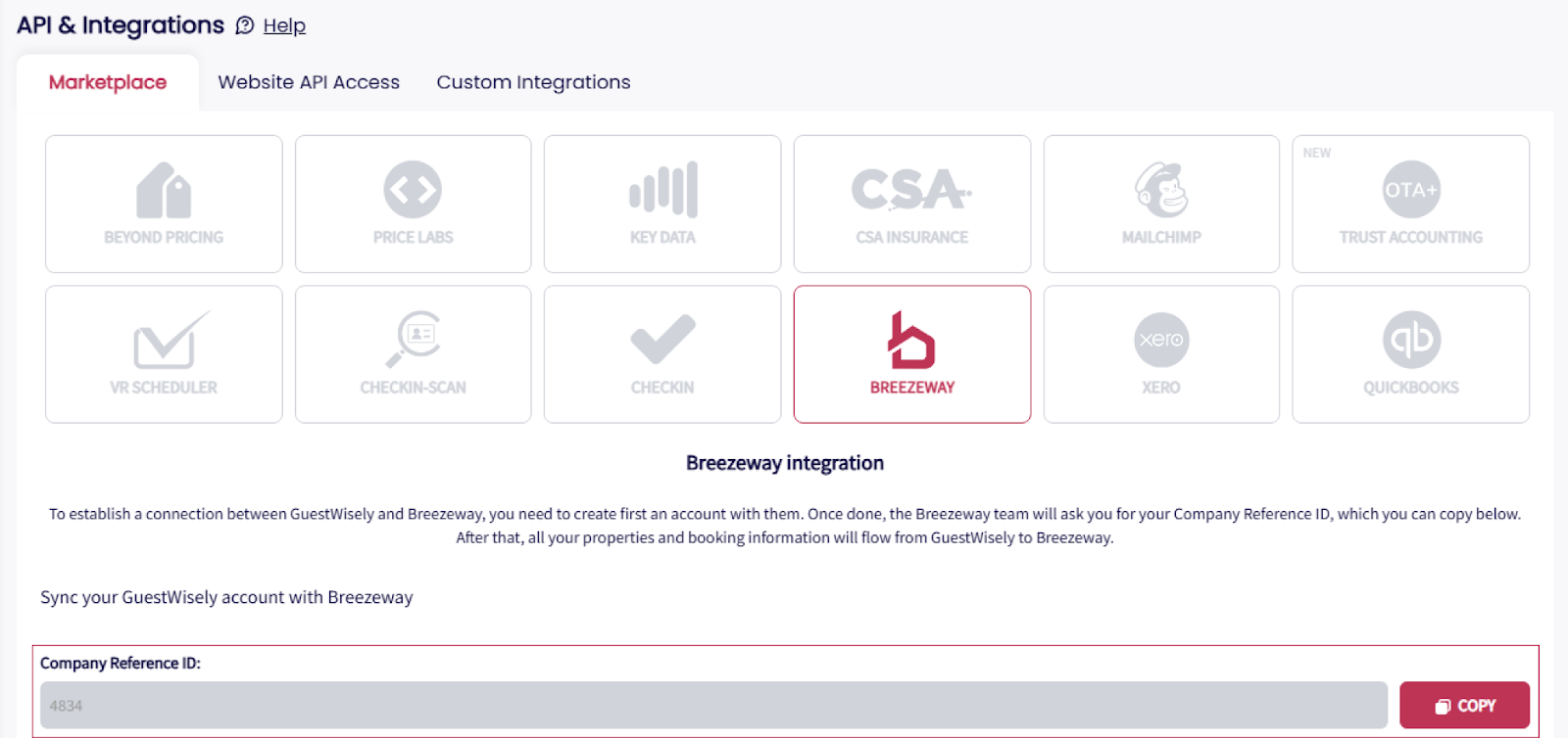 Integrar tu cuenta de GuestWisely con Breezeway permite una sincronización fluida de datos de propiedades y reservas, ayudándote a optimizar operaciones, automatizar flujos de trabajo y mejorar la experiencia de los huéspedes. Esta conexión habilita a Breezeway para recibir datos directamente desde GuestWisely para la programación de tareas, seguimiento de preparación de propiedades y coordinación de equipos.