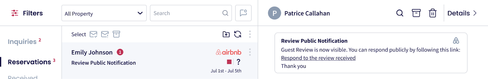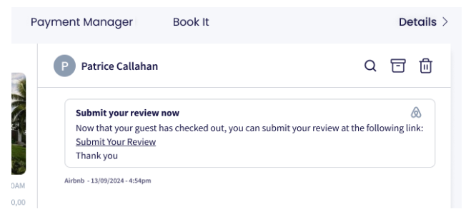 Después del checkout, las notificaciones de Airbnb y Vrbo aparecerán en tu Carpeta de Reservas, invitándote a enviar tu reseña o una respuesta pública al huésped.