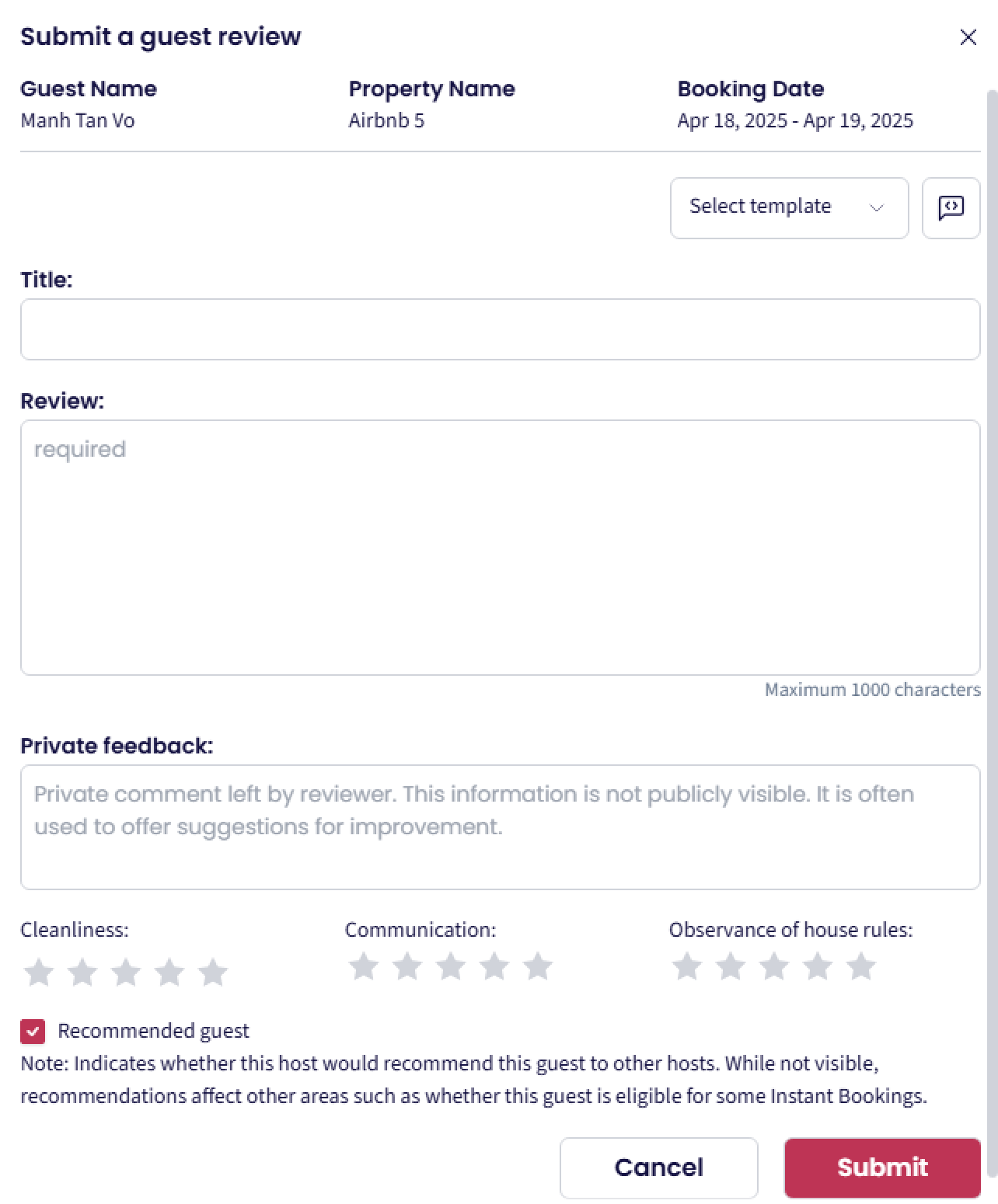 Recomendación: Indica si recomendarías al huésped para futuras reservas.