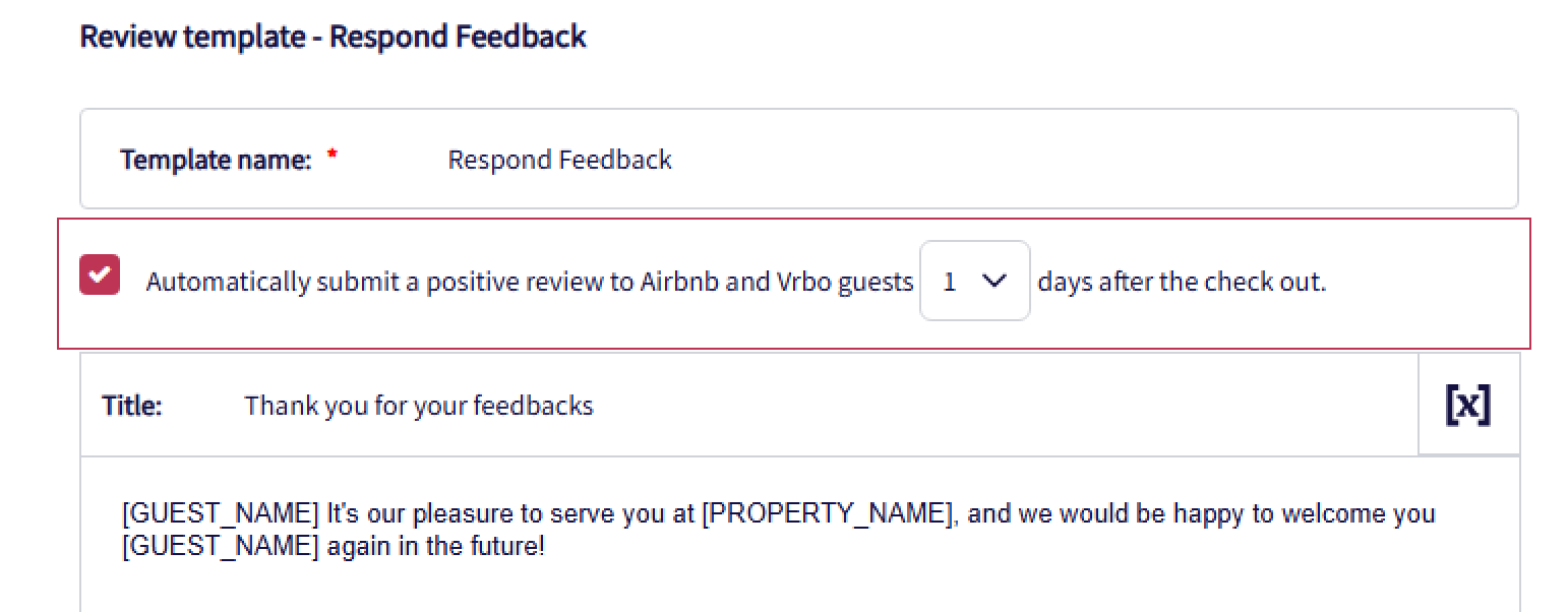 Para ahorrar tiempo y garantizar que las reseñas se publiquen en tus anuncios de Airbnb/Vrbo, el sistema envía automáticamente una reseña positiva X días después del checkout (por defecto: 5 días).