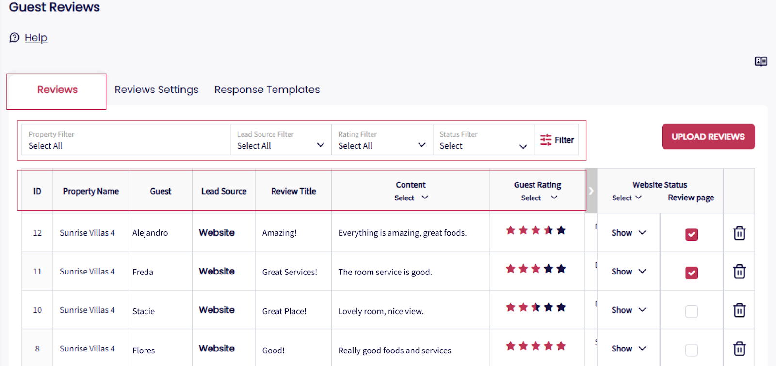 Ve a Website > Módulo de Reseñas para ver todas las reseñas de huéspedes de los canales y de tu sitio web. Filtra por: